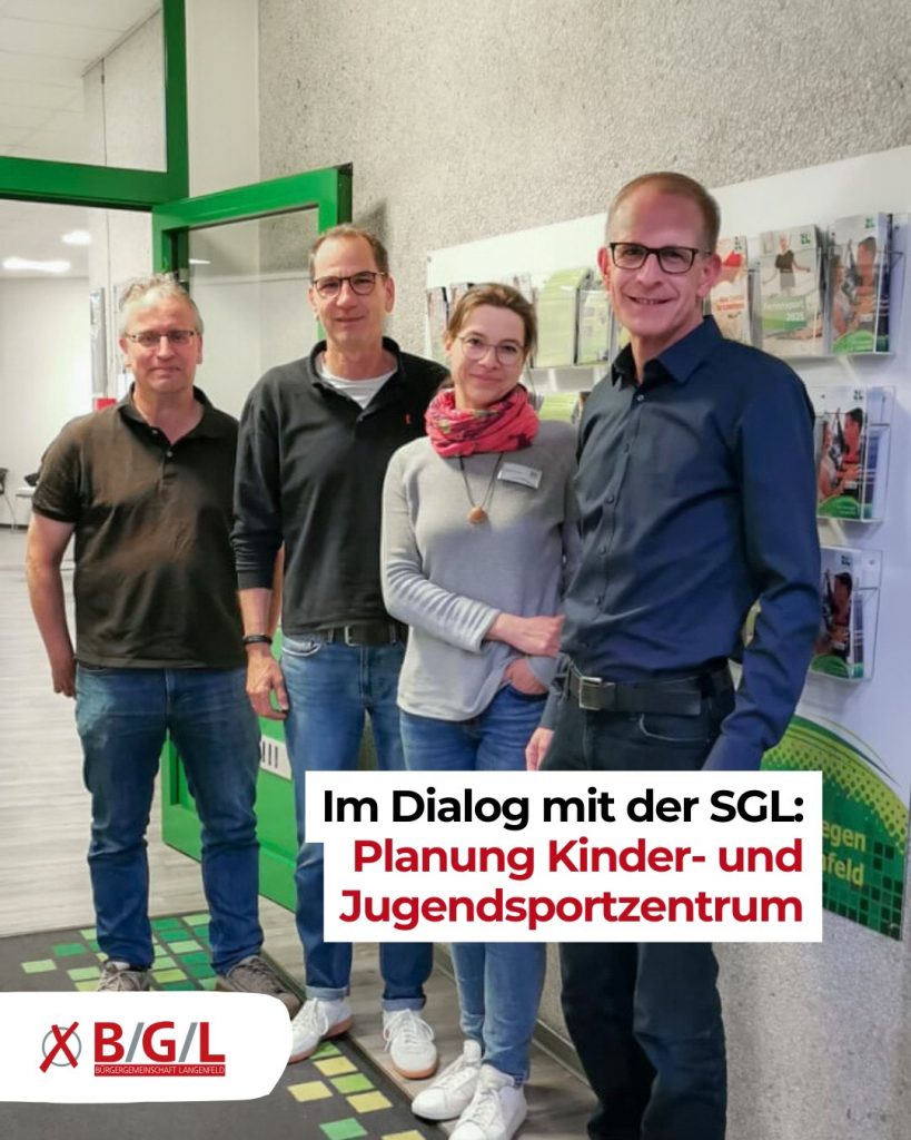 Im Dialog mit der SGL: Planung Kinder- und JugendsportzentrumÜber ein tolles Projekt haben wir mit dem Vorstand der SGL beraten können. Die Planung für ein modernes Kinder- und Jugendsportzentrum am Fahler Weg: Das innovative Konzept umfasst eine Zweifachturnhalle, ein Lehrschwimmbecken, eine fest installierte Bewegungslandschaft, mehrere Mehrzweckhallen sowie Seminar- und Ausbildungsräume.Die ersten Schritte für dieses Projekt entstanden schon vor einigen Jahren, jetzt soll die Planung von Sportgemeinschaft Langenfeld (SGL) 92/72 e.V. zusammen mit der Behinderten-Sport-Gemeinschaft Langenfeld (BSG) konkretisiert und vorangetrieben werden, erklärten uns die beiden SGL-Vorstandsmitglieder Martin Bock und Kristin Erven. Programme aus der EU, dem Bund und dem Land NRW würden das Projekt finanziell fördern.Wir von der B/G/L Fraktion unterstützen das zukunftsweisende Projekt, das in Kooperation mit der Stadt eine echte Bereicherung für die Sportlandschaft in Langenfeld bieten würde. Zusammen könnte so ein Leuchtturmprojekt für unsere Sportlandschaft entstehen.